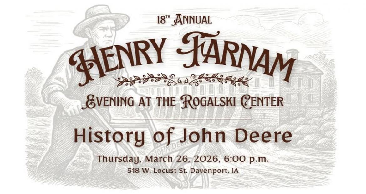 Hosted by Davenport's River Action and named in honor of Henry W. Farnam, the chief builder of the Chicago & Rock Island Railroad, the Quad Cities' Farnam Evenings are annual tributes to historically significant citizens and events. This year's 18th-annual celebration – taking place at St. Ambrose University's Rogalski Center on March 26 – will will celebrate regional history, innovation, and the legacy of influential figures who shaped the Quad Cities and American agriculture.