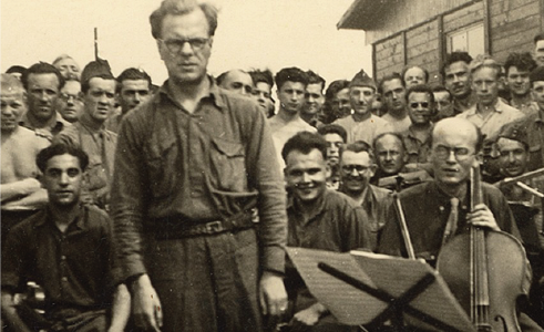 Olivier Messiaen (center), who composed, and conducted a performance of, Quarter for the End of Time in 1941 while in a German prisoner-of-war camp