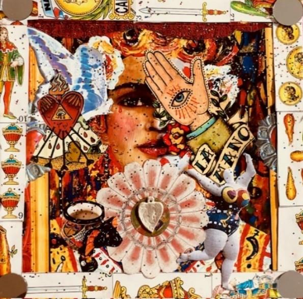 Corinne Stanley is a poet, memoirist, and artist, who currently resides in Iowa City, but has spent several years living in Mexico. Her time spent in Mexico inspired her to create Mirrors and Milagros, her most recent collection of mixed-media collages. The collages narrate an engagement with Mexican culture, featuring mirrors, and milagros, tiny metal figures that represent prayers. Tin hearts and sequined images create a vibrant and sacred environment, while loteria (Bingo) cards, and naipes (Spanish playing cards), colorfully represent popular Mexican culture. Figures of the Divine Feminine (La Virgin de Guadalupe, Anima sola) and Frida Kahlo, give tribute to an intersection of art and the sacred female journey.