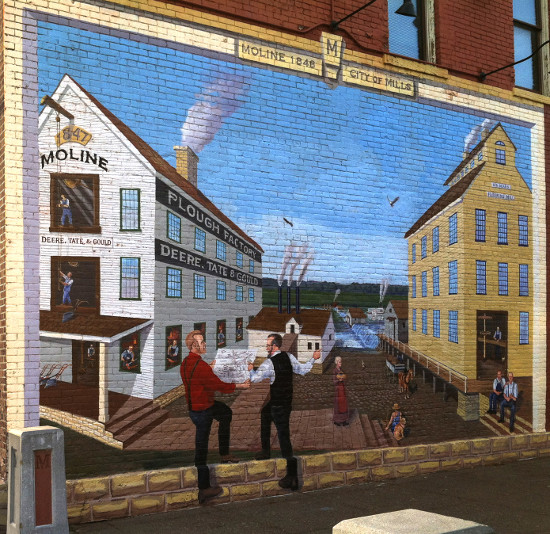 In the foreground stand life-sized representations of John Deere (holding a plan for the city) and his partner, John Gould. Painted to appear as if they are standing in front of the mural's frame, these two figures invite us to enter the artwork.