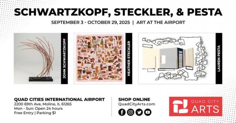 The Quad City Arts International Airport Gallery is located opposite the airport's gift shop and restaurant, there is a $2 fee for parking, and more information on the Schwartzkopf, Steckler, & Pesta exhibit on display through October 29 is available by calling (309)793-1213 and visiting QuadCityArts.com.