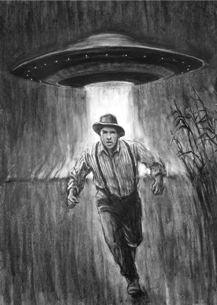 Illustration above by Bruce Walters depicts one of the stories regarding UFO encounters in Iowa which has its own chapter in the new book “Eerie Iowa”.
