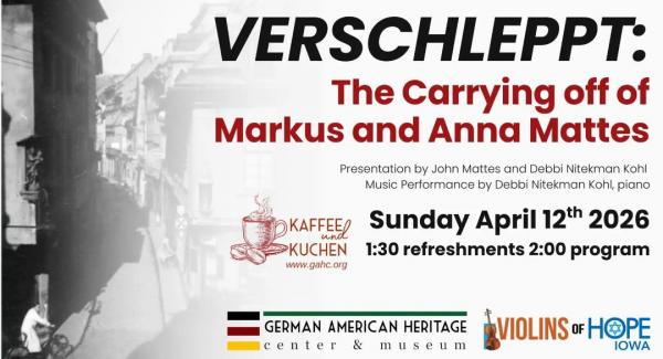 Taking place as part of the venue's popular "Kaffee und Kuchen" series, the German American Heritage Center's Verschleppt: The Carrying Off of Markus & Anna Mattes will offer a haunting, moving family saga on April 12, the program presented by John Mattes and Debbi Nitekman Kohl, the latter of whom will also deliver a powerful performance on piano.