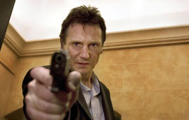 Action porn for over-protective fathers, director Peirre Morel's Taken opens with ex-CIA bad-ass Liam Neeson warning his daughter (a dementedly shrill Maggie Grace) about the dangers of traveling overseas, and while there was no doubt that he'd eventually be called upon to rescue the giggly nitwit from her Parisian "vacation," I'll admit to being mildly surprised when she found herself in peril the minute she stepped off the plane. Sadly, this is also Taken's last legitimate surprise. With its relentlessly formulaic and idiotic plotting, ludicrous dialogue, and pummeling (albeit mostly bloodless) violence, this low-rent French revenge fantasy veers so close to parody that you oftentimes don't know how to take it - at one point, Neeson infiltrates an apartment complex by hiding behind a grocery sack of baguettes (!) - and, in the end, feels like nothing so much as its country's retaliation for the whole "freedom fries" thing.