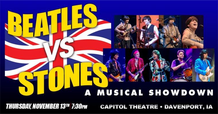 Beatles vs. Stones: A Musical Showdown comes to Davenport on November 13, admission to the 7:30 p.m. concert event is $45-90, and more information and tickets are available by visiting FirstFleetConcerts.com/first-fleet-venues/capitol-theatre.