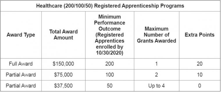 Healthcare (200/100/50) Registered Apprenticeship Programs: This funding is to be used to grow Registered Apprentices in the healthcare sector. Respondents may apply for a full award of $150,000 to grow at least 200 Registered Apprentices and will receive extra points for submitting a full award. Respondents may apply for a partial award of $75,000 to grow at least 100 Registered Apprentices and will receive extra points for submitting a partial award. Respondents may also apply for a partial award of $37,500 to grow at least 50 Registered Apprentices. The funds can be used for Related Training Instruction, supportive services, stipends to apprentices or sponsors to incentivize retention, a Registered Apprenticeship coordinator and travel. Total funding available is $150,000.
