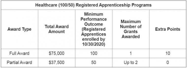 Healthcare (100/50) Registered Apprenticeship Programs: This funding is to be used to grow Registered Apprentices in the healthcare sector. Respondents may apply for a full award of $75,000 to grow at least 100 Registered Apprentices and will receive extra points for submitting a full award. Respondents may also apply for a partial award of $37,500 to grow at least 50 Registered Apprentices. The funds can be used for Related Training Instruction, supportive services, stipends to apprentices or sponsors to incentivize retention, a Registered Apprenticeship coordinator and travel. Total funding available is $75,000.
