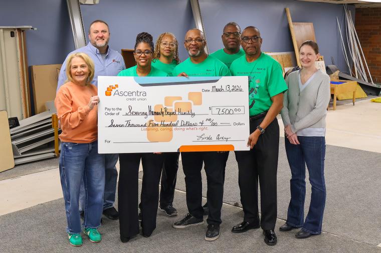 BETTENDORF, IOWA (March 30, 2026) — Ascentra Credit Union is proud to announce a $7,500 donation to Serving Humanity Beyond Humility (SHBH), a non-profit organization dedicated to promoting family growth, emotional support, and community strength in Rock Island. This contribution supports SHBH’s efforts to open a new community outreach facility designed to serve veterans, children, and the elderly by providing access to food, showers, shelter, laundry, and educational services.