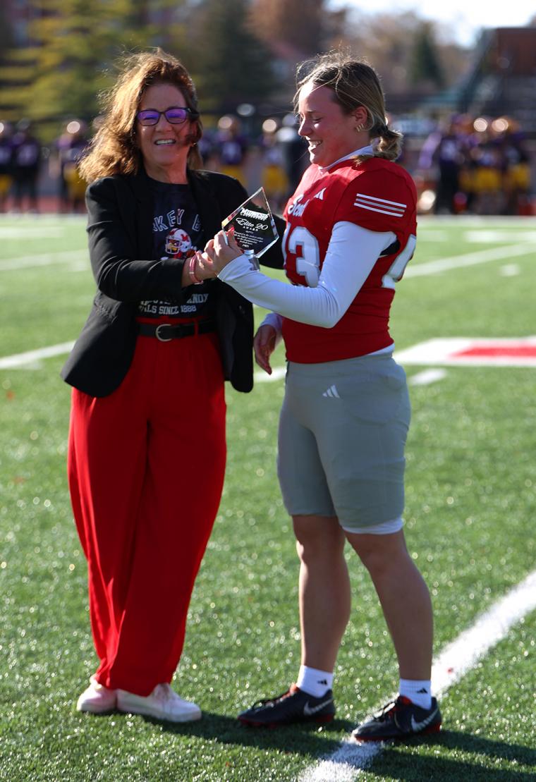 Hansen receives the Midwest Conference's Elite 20 award for football from Monmouth President Patricia Draves