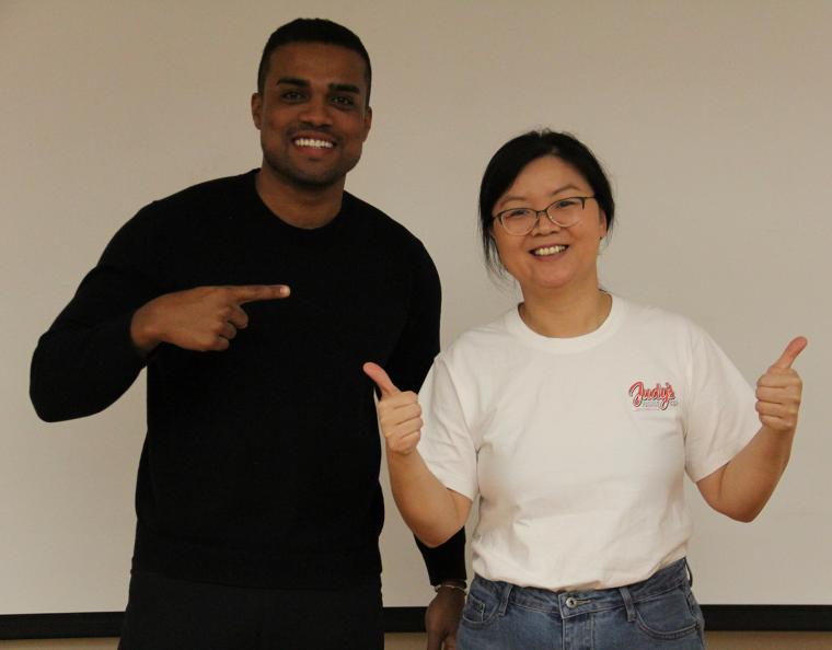 Judy's enthusiasm, humor and authenticity were on full display as she fielded questions from the professors of the class — Mike Connell and Herb Schmidt — as well as audience members. A simple one, from Connell, was about being an American citizen, which Judy said she achieved in 2023 after completing a test in Des Moines, Iowa, for which she admitted she was "super nervous."