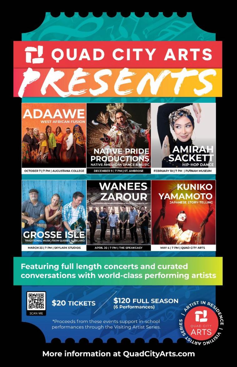 The full 2023-2024 roster of artists participating in the Visiting Artist Series includes fourteen professional performing artists providing educational activities in music, dance, theatre, and visual-arts creation. Residencies featuring artists from across the US and around the world are scheduled through May 2024 and will focus on presenting educational performing arts-based engagements in and around the Quad Cities.