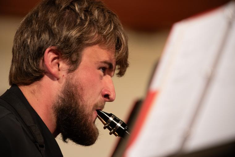 Talon Hunter ('27), shown here during the Wind Ensemble concert in October, and his bandmates will be playing some funkier selections when the Jazz Ensemble presents its fall concert November 14