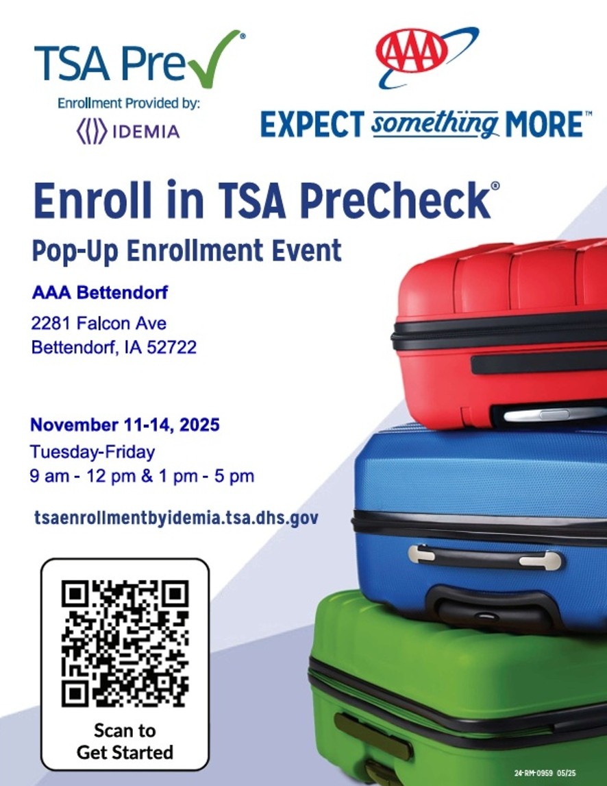 DAVENPORT, IOWA (November 10, 2025) — AAA Offices in Bettendorf, Iowa, will be hosting a TSA PreCheck® enrollment event in collaboration with