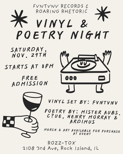 FVNYVNV Records' and Roaring Rhetoric's Vinyl & Poetry Night will take place in Rock Island on November 29, merch and art will be available for purchase from FVNTVNV Records as well as the poets, and donations to the free 8 p.m. event are not required, but are greatly appreciated. For more information, call (309)200-0978 and visit RozzTox.com.