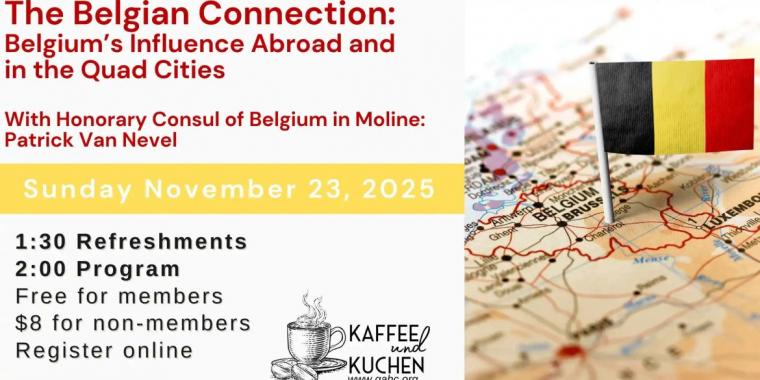 The Belgian Connection: Belgium's Influence Abroad & in the Quad Cities will be presented at Davenport's German American Heritage Center on November 23, with refreshments for this “Kaffee und Kuchen” event served at 1:30 p.m. and Patrick Van Nevelr's program beginning at 2 p.m. Participation is free for Heritage Center members and $8 for non-members, and more information is available by calling (563)322-8844 and visiting GAHC.org.