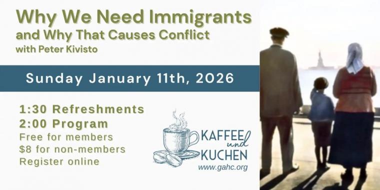 Why We Need Immigrants and Why That Causes Conflict will be presented at Davenport's German American Heritage Center on January 11, with refreshments for this “Kaffee und Kuchen” event served at 1:30 p.m. and the program beginning at 2 p.m. Participation is free for Heritage Center members and $8 for non-members, and more information is available by calling (563)322-8844 and visiting GAHC.org.