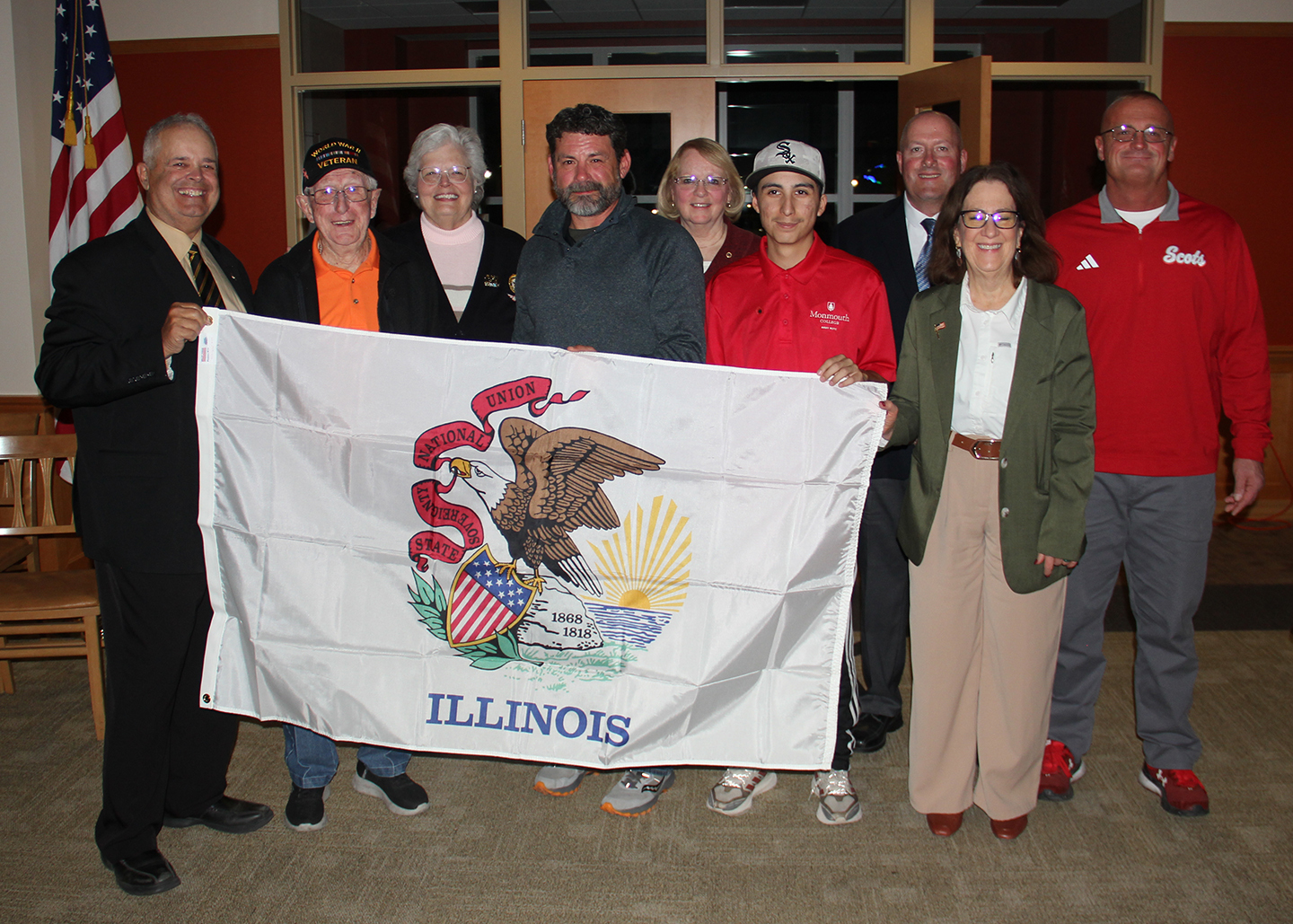 Along with Monmouth faculty member Robin Johnson, Illinois State Representative Dan Swanson (left) organized the November 11 panel discussion on campus. Also pictured are, from left, Robert Goad, Cheri Swanson, Ryan Bronaugh ('12), Rita Cross, Alfonso Mares ('12), Joe Switzer, Monmouth President Patricia Draves, and Andy Davis