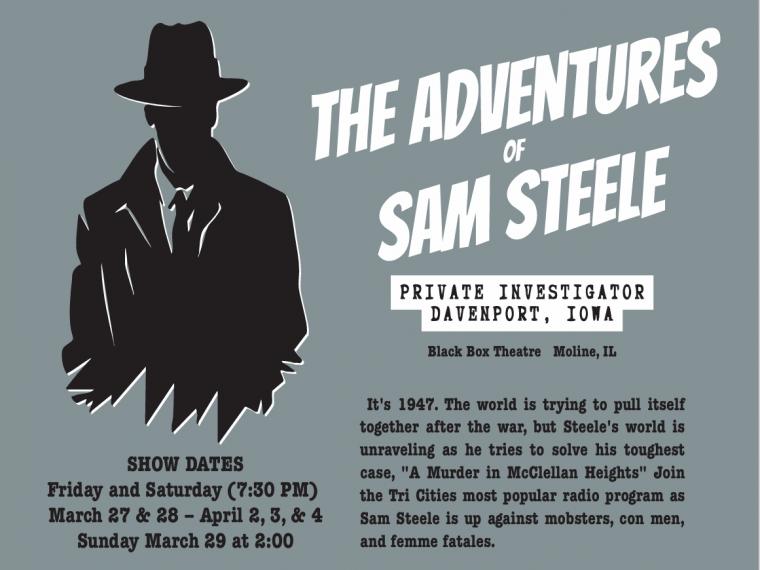 The Adventures of Sam Steele: A Radio Play runs in Moline from March 27 through April 4, with performances Thursdays through Saturdays at 7:30 p.m. and Sunday at 2 p.m. Admission is $18, and more information and tickets are available by calling (563)284-2350 and visiting TheBlackBoxTheatre.com.