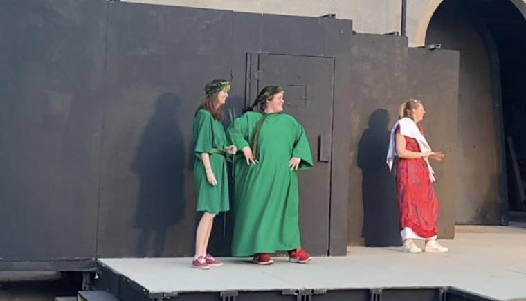 Dionysus aims to get to the underworld and retrieve recently deceased master playwright Euripides, because theatre in the realm of the living has withered. (That's not a wacky Haus of Ruckus thing – it's Aristophanes' actual plot.) In real life, Euripides really had died the year before, so that was current social satire. (And, in Guild season-ending-comedy tradition, so is this – kinda. They occasionally make mild local quips.) Anyway, he sets out with his "unpaid intern" (a.k.a. servant) Xanthius, played fantastically by a limber Jacob Lund in a welcome repeat turn in the park.