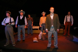 Much to his credit, Tapscott also drops all pretense of machismo in his male characters. These ranch workers are not stereotypical "men's men," throwing their weight around and putting on airs. Instead, each character seems natural, with sincerity emanating from every characterization. I believed them to be true, from Chris Zayner's hotheaded, jealous Curly, the ranch owner's son, to Mike Kelly's amiable, happy-go-lucky Candy, the crippled ranch hand who is worried that his days of usefulness are numbered. (Kelly makes good, consistent use of a sort of giggle at the end of many of his lines that helps define his character's personality, with his high-pitched, nasally deliveries of "hm-hm-hm-hm" rising in tone and inflection on the final "hm"s.)
