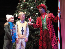 If you think, though, that the dichotomy between the opener's class and the Clauses' sass is confounding, hang tight; the stylistic leapfrogging is just getting started. After our emcees' comedic badinage (mercifully) ends, Santa and spouse take us on a global sleigh ride to Italy, Hawaii, Mexico, and Ireland, where we're treated to samplings of Christmas songs from each locale. (And each solo wonderfully sung by the likes of Joseph J. Baez, Justin Droegemueller, and Adam Ioele.) It's a fine, totally workable conceit for a holiday revue, and one soon dumped in favor of another conceit: a traditional hearth-and-home narrative in which a pair of adorable tykes snuggle up next to the fire, and awaken to the late-night chimney descent of ... Willy Wonka. (Before you exclaim, "Willy Wonka?!?", I should mention that he's not actually Willy Wonka; Baez's colorfully outfitted, top-hat-wearing character is just performing magical sleight-of-hand and singing Wonka's theme song, "Pure Imagination," from the 1971 movie. Totally different.)