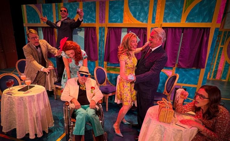 Lucky Stiff's visuals also exhilarate. Set designer and scenic artist Becky Meissen triumphs with her versatile multi-level playing space. It's a cheery mash-up of golden Art Deco lines filled in with a tasty, textured '80s palette: teal, cobalt, and fuchsia, punctuated with purple, a little orange, and luscious shades of green. With furniture brought on and off, the platforms, stairs, sliding doors, curtains, color-changing light panels, and a strip of chaser lights transform the space into a train car, high-roller’s suite, and cabaret stage. Brief scenes played at the sides without the color-explosion backdrop, in Harry’s tatty crib and an optometrist’s office, are realistically dressed to impress.