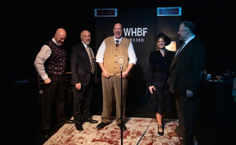Friday’s show began with a charming twist. The actors milled about the stage, in character, and in silence, preparing the 1947-style radio studio set (nicely realized by Michael Kopriva). They shuffled scripts, poured water, and set the scene as though we were the live studio audience for a beloved WHBF radio program, tuning in for the next installment of The Adventures of Sam Steele. It was an engaging and immersive start, transporting us into the broadcasting world before the pre-show announcements even happened.