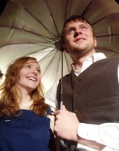 Watch the ensemble members, though, after they leave the playing area. When they're not enacting characters in Carousel's romantic tragedy, Bertelsen has his performers sit on the side of the stage in full view of the audience, and instantly, they are their tormented Jewish counterparts. Some gaze miserably at their feet, some stare forlornly into space, yet wherever their attention lies, it's not on the action occurring directly in front of them. Expressing heartache and terror with nearly painful nuance, the actors are lost in their own, private reveries, and when they get up to return to the musical - or to join Danner in providing accompaniment - they do so in speedy, businesslike bursts of movement; the characters' subtext is clear: Do your job, do it when you're supposed to, or suffer the consequences.